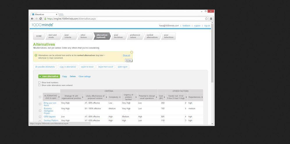 1000Minds decision-making software (web-based) helps you make well-informed, rational decisions. The decision models are fast and transparent.1000Minds helps organisations prioritize alternatives or individuals (eg. patients for treatment) in a consistent, fair and defensible manner.Three elements are fundamental to most 1000Minds applications: Alternatives (or individuals) being considered by decision-makers, Criteria by which the alternatives are compared and Weights representing the relative importance of the criteria.