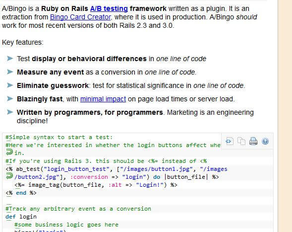 A/Bingo is a Ruby on Rails A/B testing framework written as a plugin. It is an extraction from Bingo Card Creator, where it is used in production
