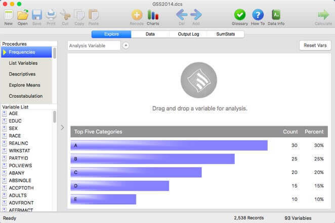 AcaStat software allows simple and inexpensive data analysis. Allows easy creation of data files, working with files imported from other database sources or even delimited text. Performing tests such as cross tabulation, descriptive statistics, correlations, and significance tests become accessible to any user, even those who know little or nothing about statistics and / or coding. The variables can be entered for analysis by drag and drop, and the software automatically executes the selected procedure.