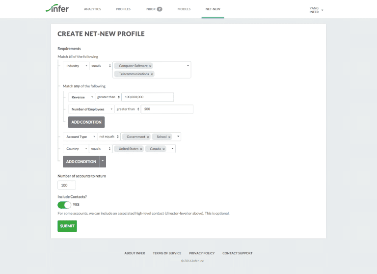 The new demand generation capabilities released today leverage Infer’s novel profiling approach to build on the net-new offering the company launched last summer with partners like InsideView. Infer Profile Management combines data that’s trapped in companies’ internal systems with thousands of proprietary external signals. It intelligently matches, merges, interprets and filters all of these data points to create actionable intelligence in the form of data-rich, descriptive prospect profiles. Since its beta launch four months ago, dozens of customers have built over 2,750 profile combinations on the platform.
