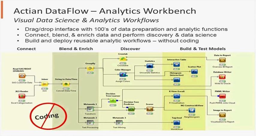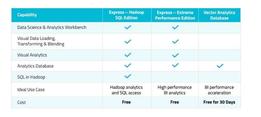 Actian Express – Hadoop SQL Edition includes Data Science Workbench, Data Flow Engine, Analytics Database, Management Console and Preloaded Data and Tableau Workbooks. The Data Science Workbench build visual workflows to prepare, blend and analyze Hadoop data and Data Flow Engine execute analytic workflows at least 10 times faster than MapReduce – without coding. The Analytics Database run high-performance SQL queries natively in Hadoop and the Management Console easily monitor and manage your Hadoop analytics platform. The preloaded Data and Tableau Workbooks lets to use the platform immediately upon download.