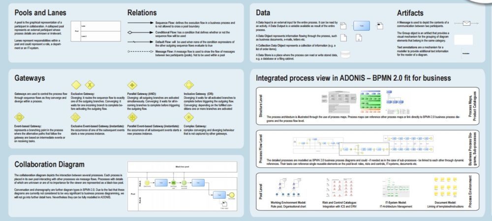 ADONIS:CE provides BPMN 2.0 support with Process Modeling and Choreography Conformance. Along with the Business Process Diagram, a Choreography and Conversation Diagram are included.