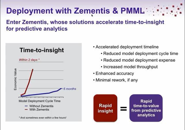 Agile Deployment of Predictive Solutions using Zementis : Zementis, provides software solutions for predictive analytics. The core PMML based solutions are ADAPA, a decision engine for predictive analytics, and UPPI, a universal plug in utility for industry leading analytics and data warehouse platforms. Agile deployment of predictive solutions is the cornerstone of the Zementis philosophy. Zementis customers can deploy these solutions on premise or in the cloud, with access via an intuitive Web based console, via one of multiple industry leading analytics platforms or as a simplified Hadoop interface. Zementis accelerates the deployment of predictive models, thereby accelerating business insight. Zementis solutions are based on PMML, the Predictive Model Markup Language, which strips away the complexity of model-to-model translation and data science-to-IT operationalization. PMML is an XML based language that eliminates the need for custom code, and is recognized as a mature industry standard. By combining its proprietary technologies with the PMML standard, Zementis helps remove the complexity of translating and operationalizing predictive models.