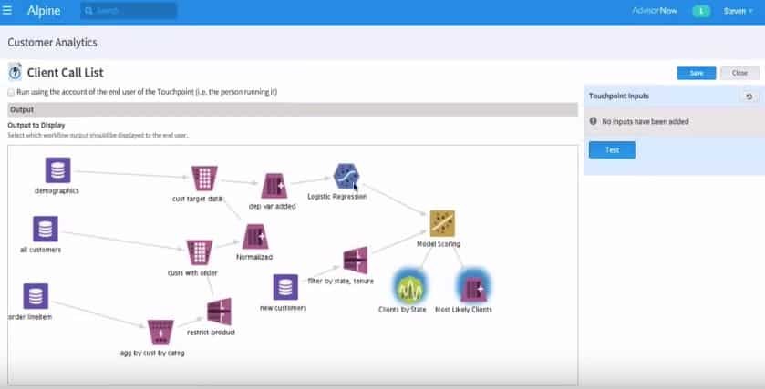 Alpine Touchpoints, accessible Predictive Analytics to the Business User : Alpine Touchpoints, is a new way to make Advanced Analytics accessible across an Enterprise. Touchpoints is an industry-first application services layer that enables business users to interact with complex analytic assets and incorporate them into their existing activities and workflows. Touchpoints transforms the genius of data science into business assets that enrich the daily activities of the people who drive business value every day.Enterprises have spent billions of dollars on big data platforms and initiatives but have struggled to find enough data scientists to create business value. Alternatively, it is extremely difficult for business analysts to utilize insights from data scientists at everyday scale. To resolve this gap, some have attempted to train business users to build complex models themselves, or to deploy data scientists tactically, but neither approach addresses the larger need to scale data science to thousands of employees.