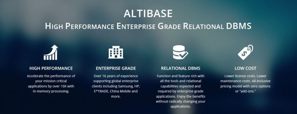 Altibase is an in-memory database (IMDB) with a fast working, user-frinedly hybrid architecture. Altibase is a single database delivering high intensity processed date via an in-memory database portion and large storage capacity through an on-disk database portion. It is very flexible, relational ANSI SQL compliant and ACID compliant. It also offers easy SQL code and skills migration. HW & OS agnostics included. It keeps users current DBAs. Reduces HW & SW cost by in-memory + on-disk DBMS under 1 license. Over 20 years of enterprise grade RDBMS experience. Over 550 enterprise clients with thousands of deployments. Altibase has proven to be 10 times faster than conventional on-disk databases.