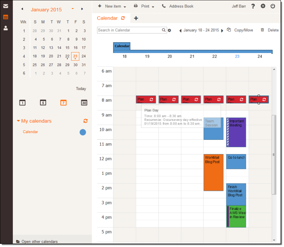 Amazon WorkMail is a secure, managed business email and calendar service with support for existing desktop and mobile email client applications. Amazon WorkMail gives users the ability to access their email, contacts seamlessly, and calendars using the client application of their choice, including Microsoft Outlook, native iOS, and Android email applications, any client application supporting the IMAP protocol, or directly through a web browser.