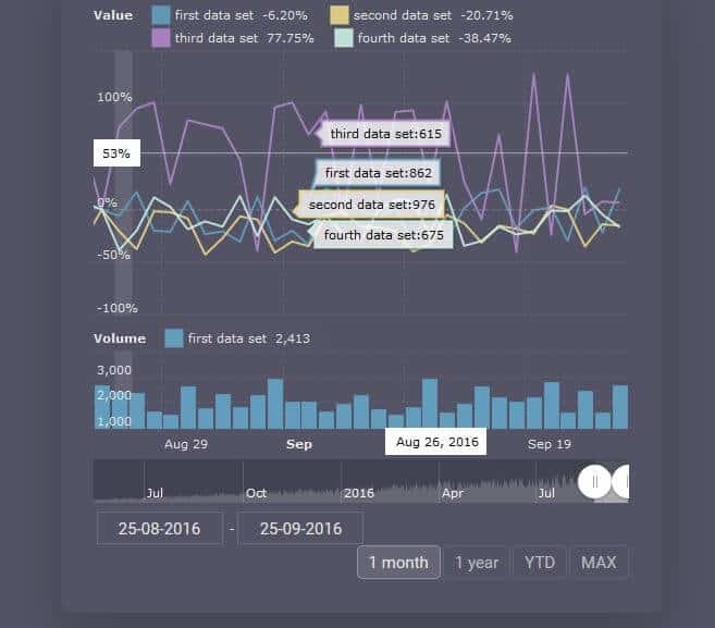On the other hand, JavaScript Stock Chart from amCharts does multiple panels, automatic data point grouping, multiple data set and data comparison. Its own independent data source provides a powerful analytic tool that gives users the most accurate and easy to understand information that is crucial for the business. And with its interactive features, users can zoom or pan serial charts, drill-down to other data levels, select slices, toggle graphs using legend, display HTML-rich contextual info and even draw trend lines directly on chart, making it even productive and detailed for more business opportunities.