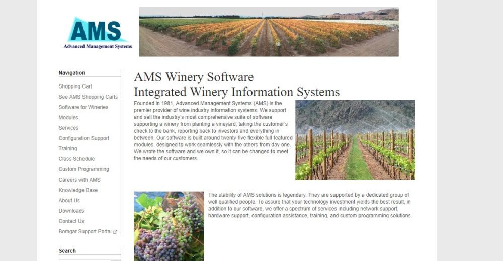 AMS wine module tracks production activities starting with grower contracts and ending with bottling. Advanced Management Systems (AMS) is the premier provider of wine industry information systems. It supports and sells the industry’s most comprehensive suite of software supporting a winery from planting a vineyard, taking the customer’s check to the bank, reporting back to investors and everything in between.