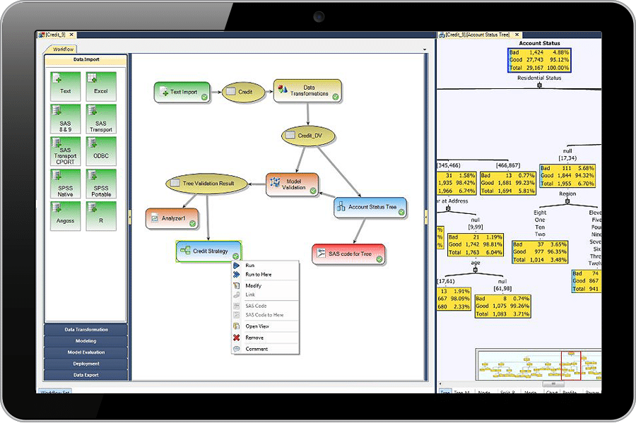 • Modeling ; Partial Least Squares Regression (PLS Regression) ,Constrained logistic regression, Regularization, Scorecard editor, Survival Analysis, Model Selector.