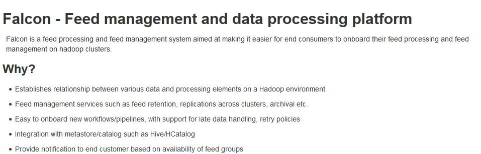 Falcon is a feed processing and feed management system aimed at making it easier for end consumers to onboard their feed processing and feed management on Hadoop clusters. The platform gives users the ability to establish the accurately relationship between various data and processing elements on a Hadoop environment.