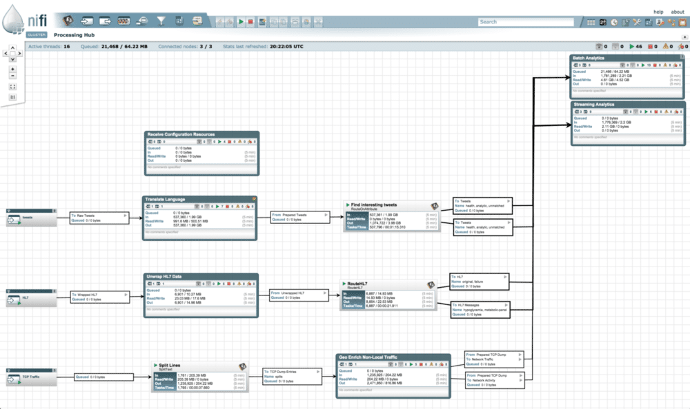 Apache NiFi supports powerful and scalable directed graphs of data routing, transformation, and system mediation logic. It is the first integrated platform that solves the real-time challenges of collecting and transporting data from a multitude of sources and provides interactive command and control of live flows with full and automated data provenance.