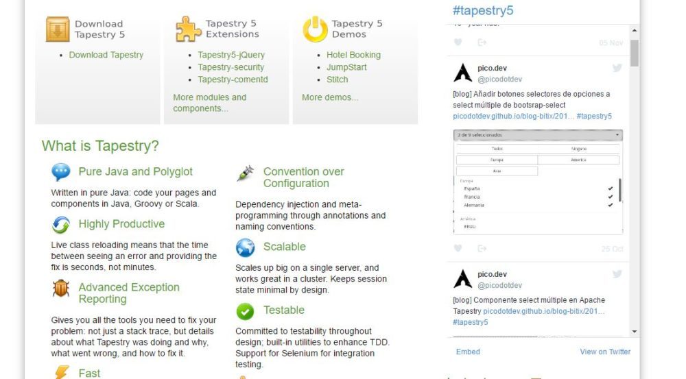 Moreover, Tapestry’s architecture is open and extensible. It shows a clean way to add extensions or override built-in-logic, and provides integration with Hibernate, JPA, and Spring, and other third-party tools such as Quartz and Lucene. Tapestry, also has all the benefits to test itself and provide immediate solutions. It offers built-in utilities to enhance TDD, support for Selenium for integration testing, stack trace, detailed reports on system failure and live class reloading to implement solutions immediately.