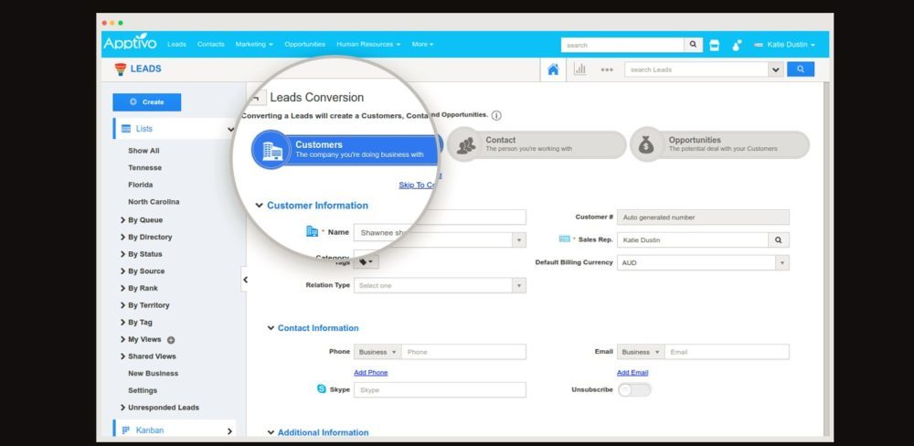Apptivo’s customer relationship management (CRM) applications provide modules for contact management, lead management, opportunity management and customer service ticket management.