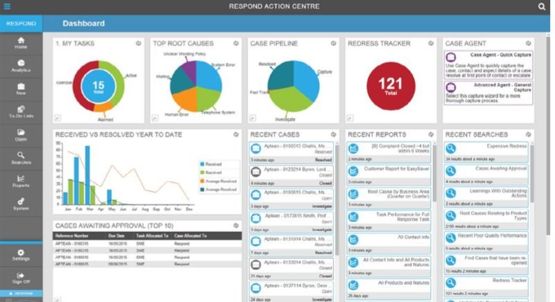 Now available on tablet devices, Respond 6 features a brand new streamlined User Interface, where all customer complaint data is captured in detail and viewed via drillable dashboards. The overhauled dashboard system includes time critical information such as incoming regulatory case work, outstanding approvals and additional critical information for seamless regulatory reporting. In addition, Respond now provides editable templates for frontline staff to send personalized Summary Resolution Communications (SRC) to customers, which is expected to be a new UK regulation for Financial Services firms under the FCA.