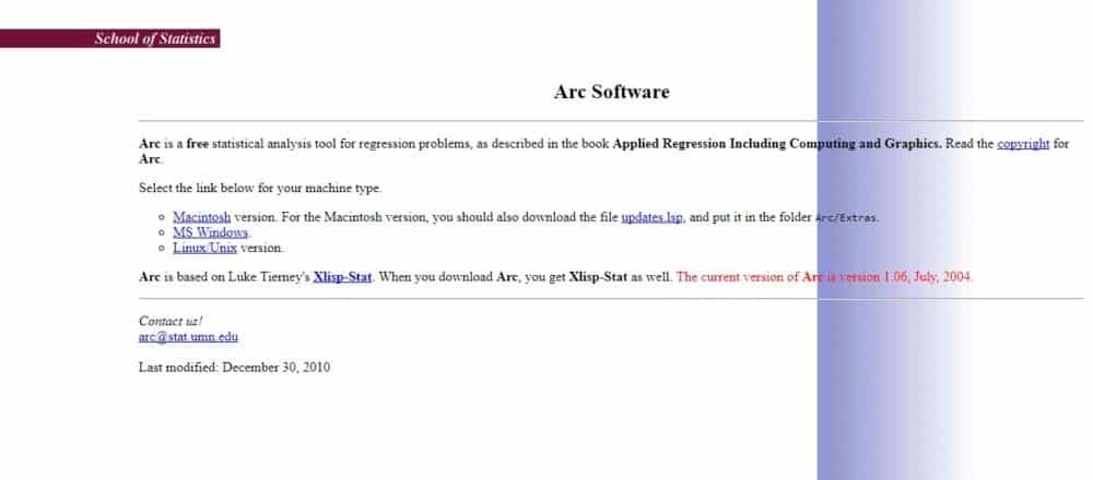 Arc software versions are available for Mac, Linux/Unix, and Windows devices. Any changes, updates, and other support documentation are also available on the Arc software’s website. Arc can also be extended using the Xlisp-Stat program to add new functionalities such as new smoothers, new fitting methods, new menu items, and more.