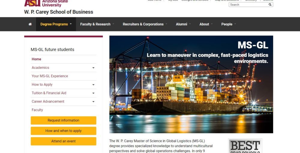The Master of Science in Global Logistics (MS-GL) degree offered at the Arizona State University’s W. P. Carey School of Business is designed to help students comprehend multicultural perspectives and solve global operations challenges. With a W. P. Carey Master of Science in Global Logistics (MS‑GL), you can build a robust foundation for a successful career in the supply chain logistics field. This program can be completed in nine months and will help you develop expertise in global logistics as well as gain significant insight into emerging markets. The program is taught by a world-class faculty that brings cutting edge research and decades of real-world experience into the classroom. The W. P. Carey MS‑GL curriculum focuses on logistics methods, cross-cultural management and leadership, emerging markets, and global perspectives. In addition, an off-campus trip offers you an exclusive look at global logistics infrastructure and helps you develop a real-world perspective on concepts covered in class. The campus is located closer to the Phoenix West Valley, a fast-paced logistics industry, giving you better access to networking opportunities and key companies in the logistics field. Again, the program’s lock-step class format allows you to build on concepts throughout the program, learning alongside people from diverse backgrounds but who hold similar career aspirations. Furthermore, the W. P. Carey Graduate Career Center (GCC) helps you expand your career possibilities, develop critical skills, and build a professional resume. The career center will also help you streamline your job search and professional development goals with personalized coaching sessions. Students can also leverage on the school’s strong alumni network consisting of over 90,000 W. P. Carey alumni across the globe for endless opportunities that include landing internships and job contracts.