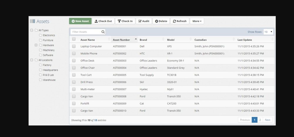 Asset Manager Web Edition is an easy-to-use online web application for tracking company asset records. Asset Manager Web Edition includes an asset history which is automatically maintained as assets are audited or checked in or out, reports which allow users to print a list of all assets, checked out assets, or an audit check list, a complete Personnel and Vendor database and granting users access to the system with Roles which determine the level of access.