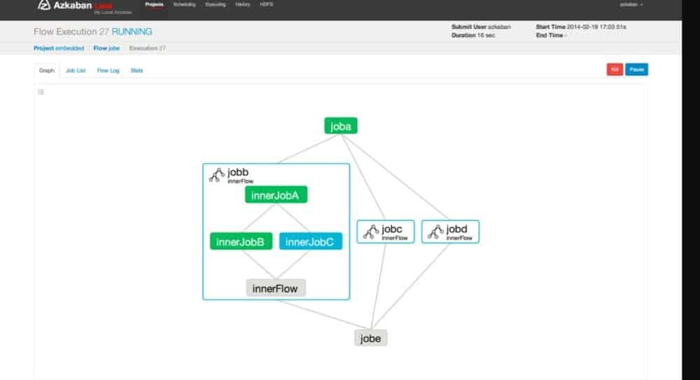 Azkaban is a robust server solution which was implemented at LinkedIn to solve the problem of Hadoop job dependencies that needed to run in order, from ETL jobs to data analytics with its 3 key components like the Relational Database (MySQL), Azkaban Web Server and Azkaban Executor Server. Azkaban has features such as project management, executing flow state, previous flow and jobs, scheduler and SLA.