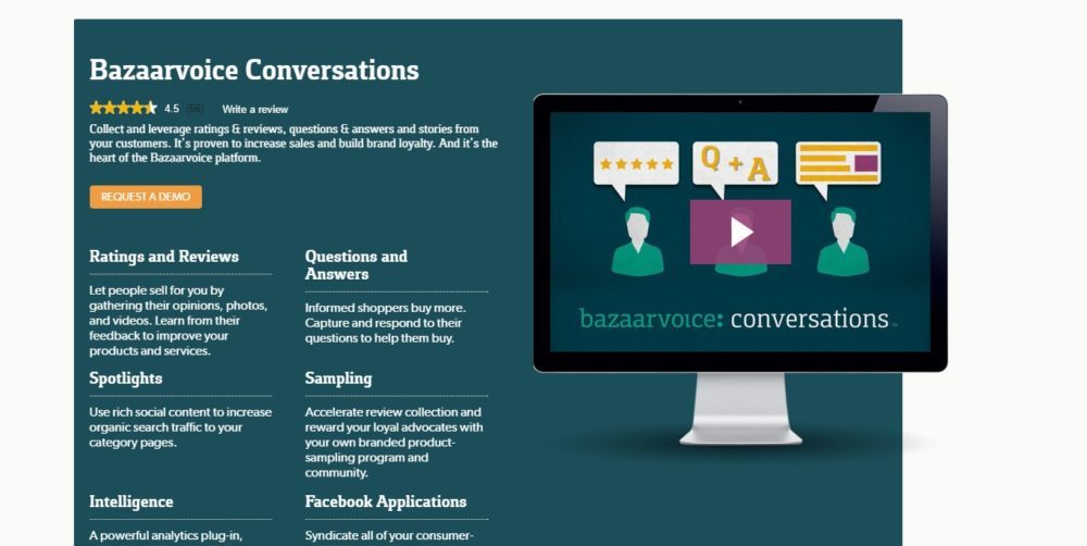 Bazzarvoice increases engagement, trust and conversion by displaying authentic moderated social content directly on your site. This in turn allows a business to reach and influence true in-market shoppers. The solution also allows for an enterprise drive retail channel sales by collecting consumer reviews and distributing them to retail e-commerce sites.