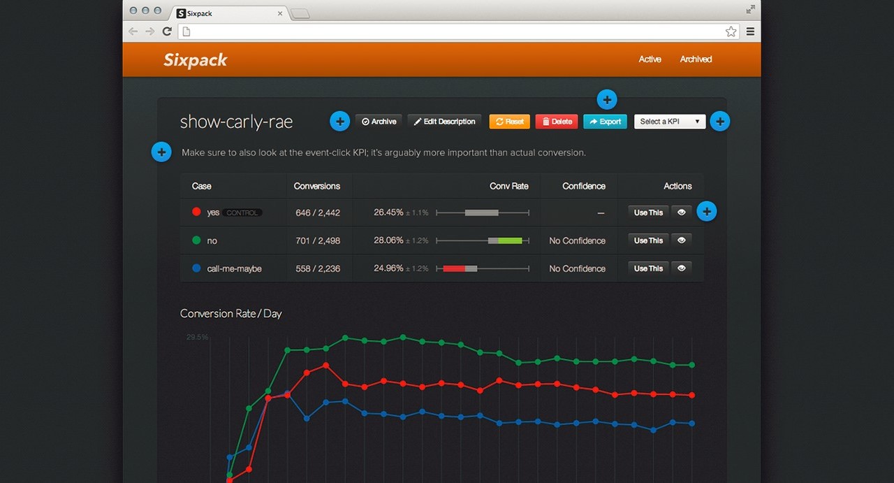 Sixpack makes it easy to run A/B tests across multiple web services written in different languages. It includes a beautiful dashboard for viewing test results and choosing winners. Sixpack is a language-agnostic ab testing framework which helps to toggle a test variation in Javascript, track conversions in Ruby, and record a KPI in a Python service along the way. Sixpack can initiate a test with a few lines from your client library(ies) of choice. Once a user enters a test it will automatically show up in the web UI. Sixpack has a simple, elegant web UI that presents all experiments…