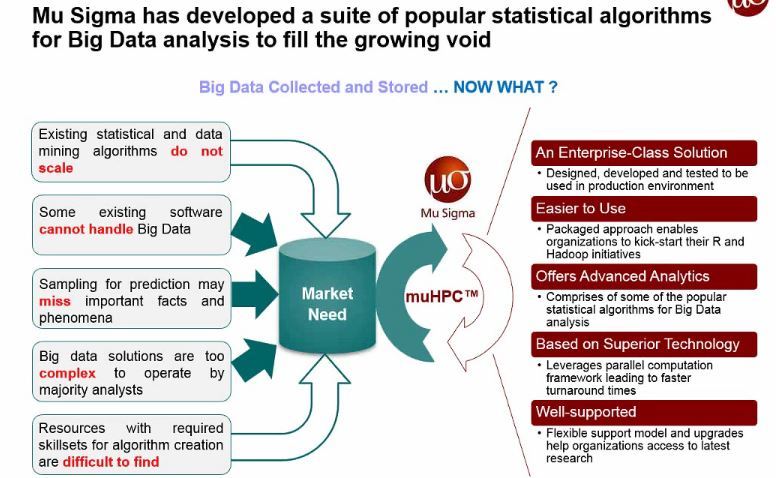 Traditionally, enterprises that wanted to leverage R and Hadoop for Big Data analysis have had to write their own algorithms, or rely on open-source options that had not been widely used or tested. Quality varied, and it was a challenge for companies to acquire talent with relevant skills and competencies in order to code their own algorithms. Mu Sigma's offering enables enterprises to accelerate their R and Hadoop initiatives, and their overall Big Data analysis programs.