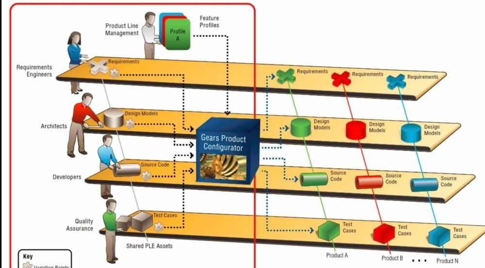 The Product configurator automatically assembles and configures systems and software assets including requirements, design, and development and testing guided by product feature profiles, to produce the products in a company’s portfolio. The solution also provides a unique gears development environment for managing the portfolio-specific facets of systems and software development including a robust collection of browsers, views, languages, constraints, editors, dashboards, wizards and analytical tools.