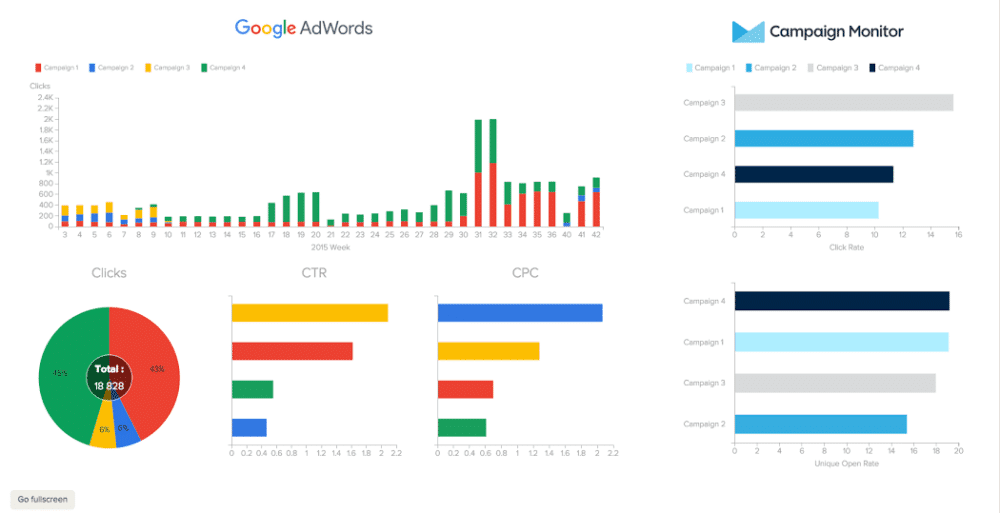 Build a dashboard with a mouse and a couple clicks. Share it instantly with the world and let your users drill down, drill through and filter the data.