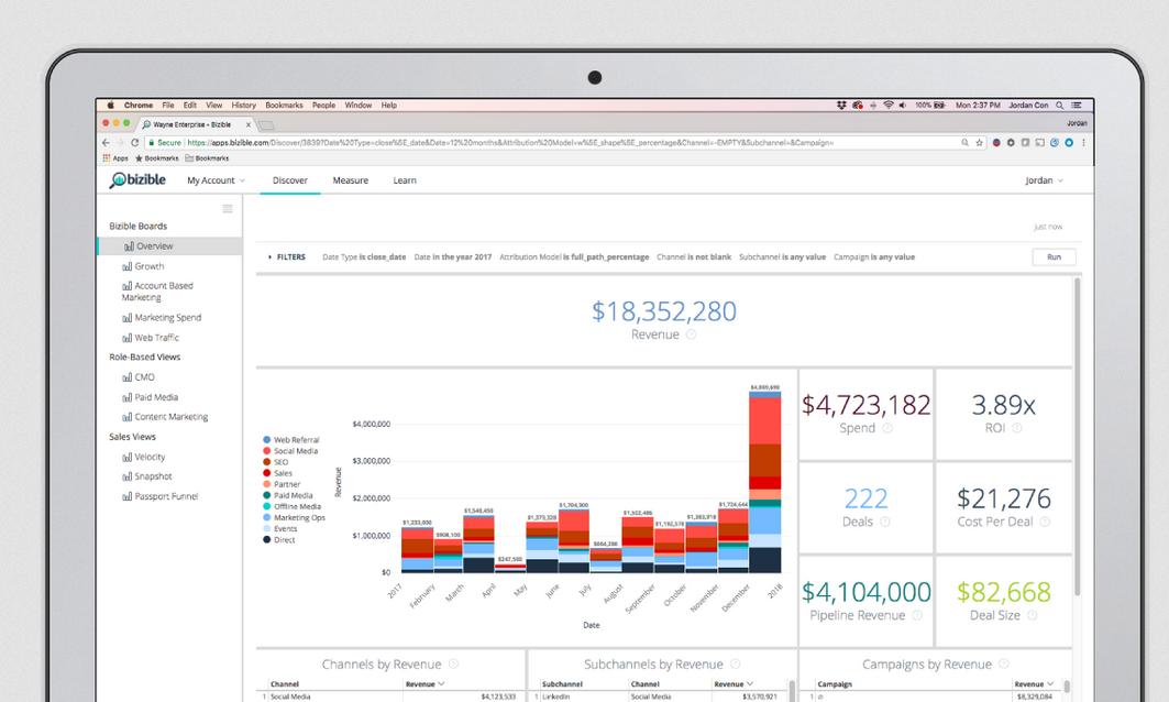 Bizible automatically track marketing interactions across all channels, from keywords to conferences and everything in between.Insights to help you measure and optimize marketing efforts for revenue to maximize growth and understand and impact the future with a goal-oriented and high fidelity forecast to help you make decisions.