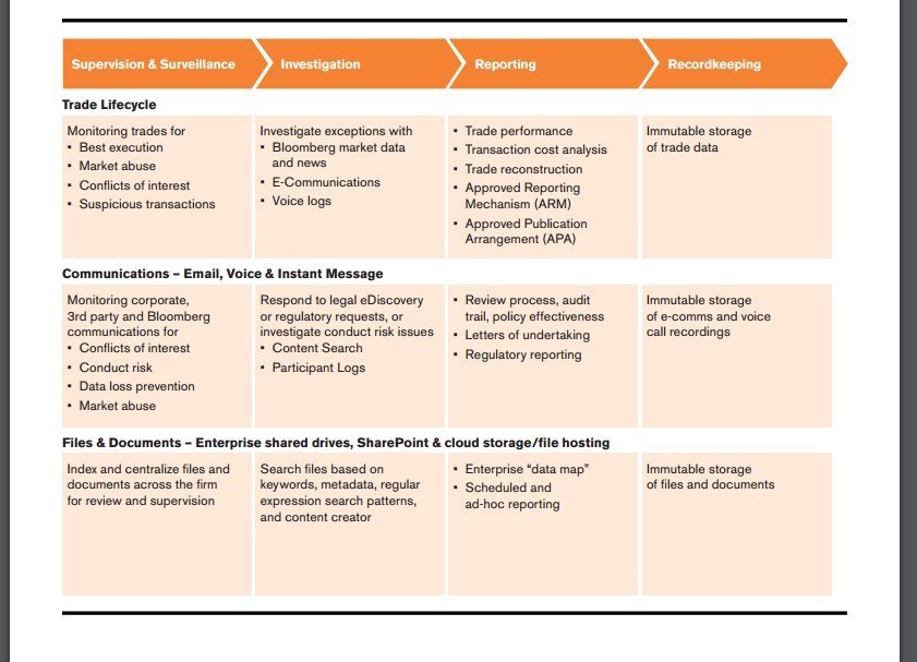 Benefits of this archive are supporting TLS Encryption, incorporating an industry leading email security system, access controls for all compliance and legal administrators etc. Information analytics includes file analytics, trade reconstruction and e discovery. Using file analytics users can search and analyze dark data across corporate file shares and cloud repositories. With file analytics an enterprise “data map” for IT storage management and visibility can be created, policy driven surveillance across files, shares and repositories, ad – hoc and scheduled reporting etc.