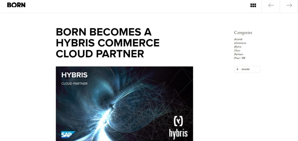 BORN is among an elite group of companies SAP has recently signed as a Cloud for Commerce Partner. The program enlists experienced hybris partners who have extended the hybris Commerce Accelerator with additional integrations and functionality to create a pre-packaged solution for both the B2B and B2C market.