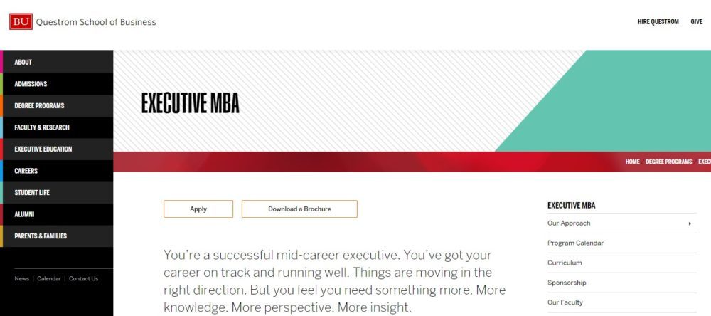 The executive MBA offered by the Boston University’s Questrom School of Business is designed for mid-career executives who want to fill in the gaps in their business knowledge and develop skills at the senior leadership level so they can understand and analyze business systems in a global context and excel in any management role.