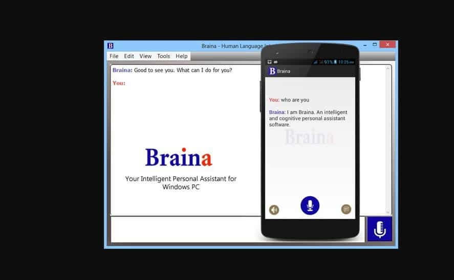Braina is an Artificial Intelligence(AI) software that performs many tasks when asked in natural language and serves as a virtual assistant that helps you perform various operations quickly