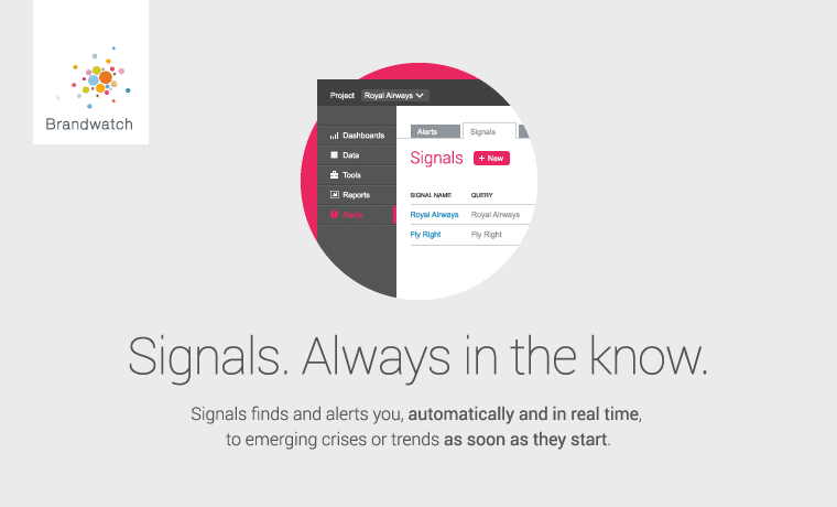 Brandwatch Signals for Automated Intelligence Alerts : Brandwatch, Signals, is an automatic intelligence alerts system of its kind in the social data monitoring industry. Signals uses real-time discovery technology to notify business executives, from the C-suite to the PR team, about significant changes in streaming social data so they can make informed marketing, messaging and security operations decisions. Brandwatch is one of the world’s leading social intelligence companies. Its social media listening and analytics technology platforms gather millions of online conversations every day and provides users with the tools to analyze them, empowering brands and agencies to make smarter, data-driven business decisions.
