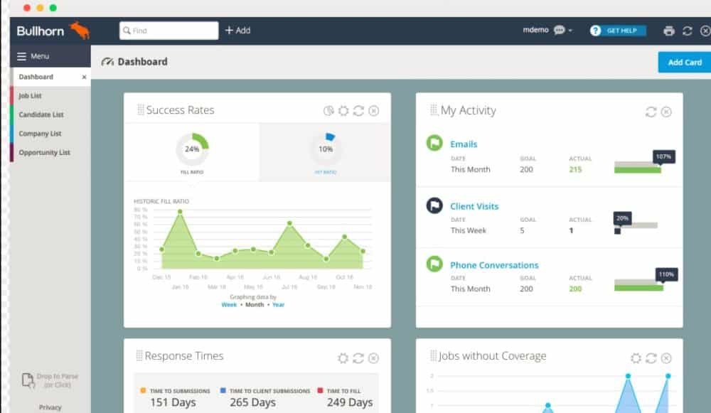 More than 7,000 staffing companies rely on Bullhorn’s cloud-based platform to drive sales, build relationships, and power their recruitment processes from end to end. Some feature of this platform includes: bullhorn CRM. With Bullhorn CRM for Staffing and Recruiting, your entire organization can accurately forecast pipeline and revenue growth. You can close the loop between sales and recruit, increase adoption of your front office systems, and gain visibility into your clients' changing business needs.
