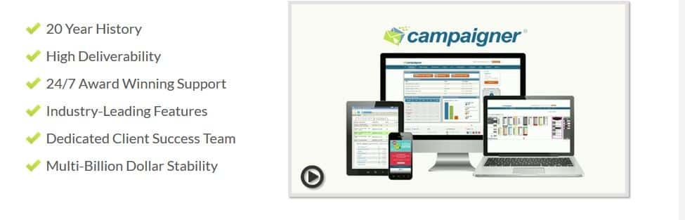 Features include professional email campaign creation, industry-leading A/B split testing, advanced list management and segmentation tools, targeted email autoresponders and workflows, powerful API and CRM integration, and detailed campaign reporting.