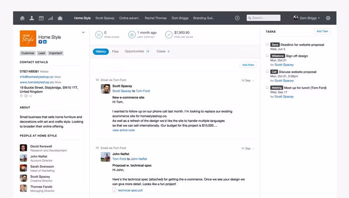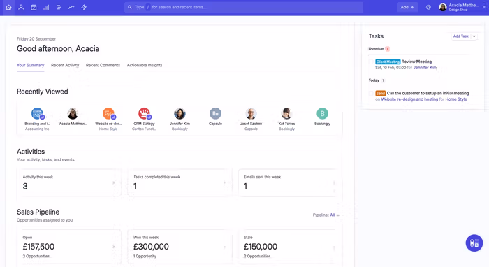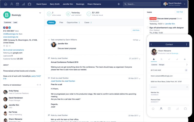 • “Lean CRM” design philosophy: Clean interface and direct workflow across contacts, deals, tasks, projects, email, and reports—without enterprise bloat.