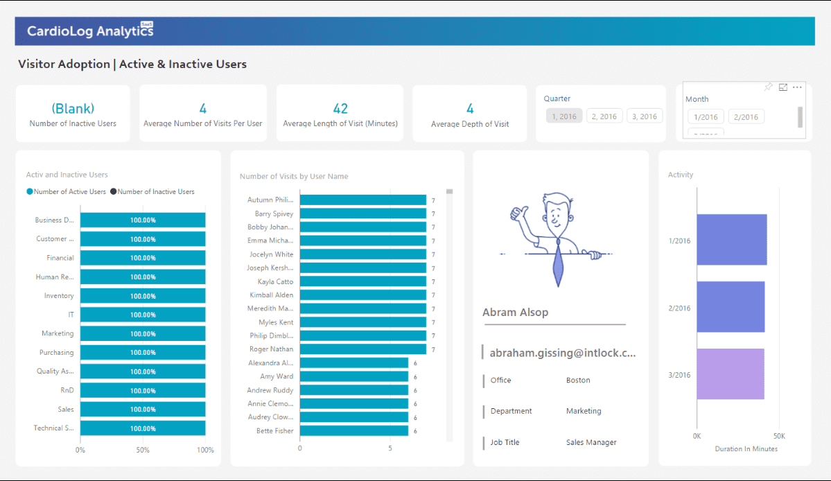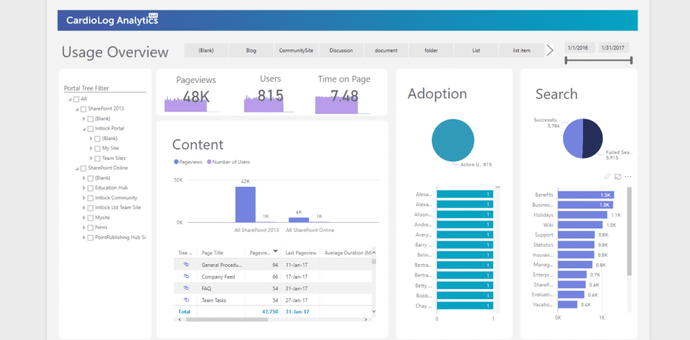 Cardiolog Analytics allows SharePoint and Office365 intranets to reach maximum potential by providing a wide range of detail-oriented metrics that reveal insights and actionable metrics that are directly related to an enterprise's success.