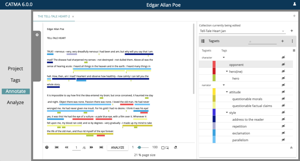 CATMA’s Tagger component enables users to annotate texts for the purpose of analysis. Annotation is done by highlighting parts of users’ text and then assigning Tag Types to them – so users don’t have to physically insert a Tag into the text. Users can either choose Tag Types from an existing Tag Set or create new Tag Types while annotating.