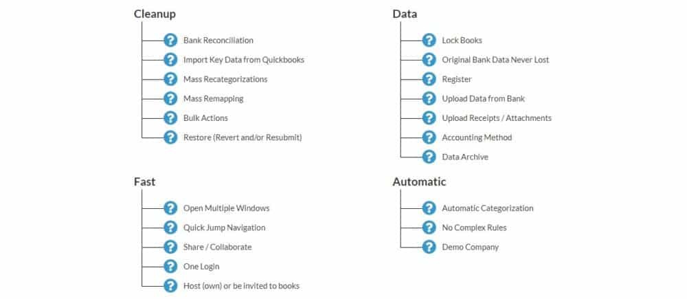 Checkbook power has the following user features; CLEANUP, this includes Bank Reconciliation, Import Key Data from Quickbooks, Mass Recategorizations, Mass Remapping, bulk Actions and Restore (Revert and/or Resubmit). The other checkbook feature is FAST, under fast it includes; Open Multiple Windows, Quick Jump Navigation, Share / Collaborate, One Login, Host (own) or be invited to books. DATA is the other feature, under data we have; Lock Books, Original Bank Data Never Lost, Register, Upload Data from Bank, Upload Receipts / Attachments, Accounting Method and Data Archive.
