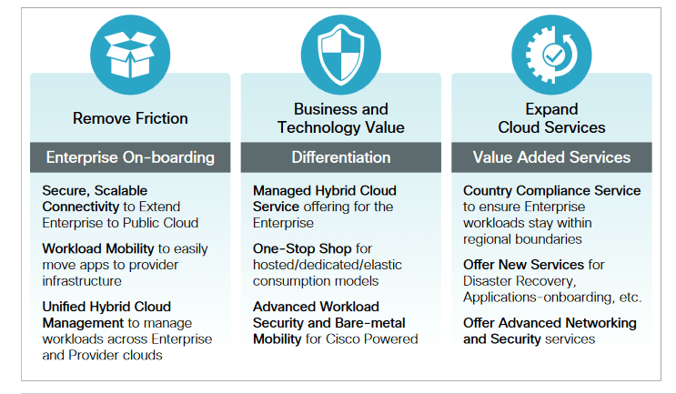 With Cisco Intercloud Fabric, this helps the company deploy highly secure hybrid clouds. It allows connectivity to a large ecosystem of cloud providers to support hybrid cloud deployments for enterprises.The product is ideal for service providers that wanted to provide a hybrid cloud deployment model and become part of the Intercloud Fabric ecosystem.