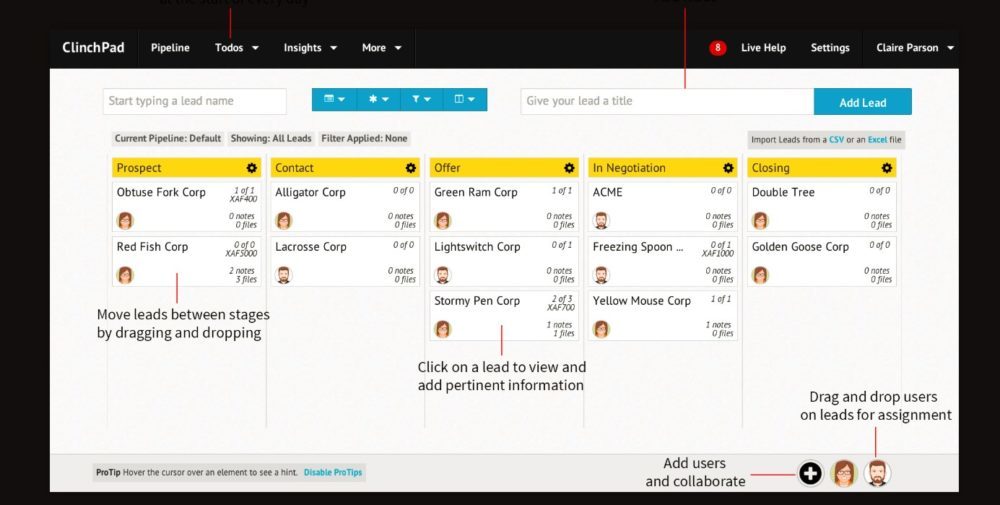ClinchPad is a CRM software that is simple and uses an easy to use interface to offer small teams with an excellent platform to track and organize leads.