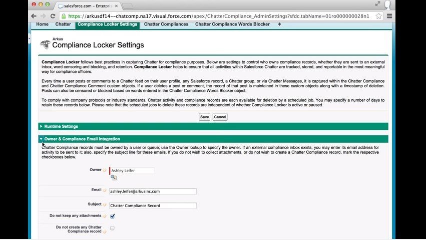 Compliance Locker by Arkus employs best practices for capturing all Chatter activities in various ways and by allowing administrators to customize retention settings.
