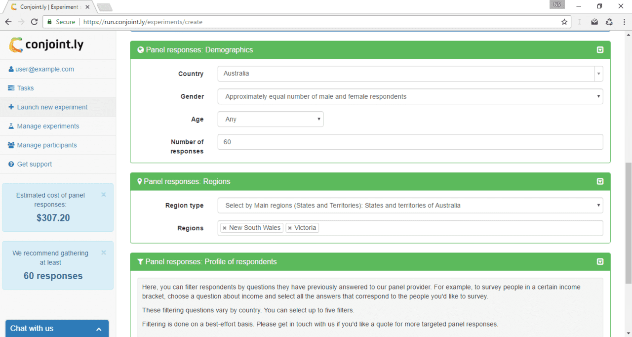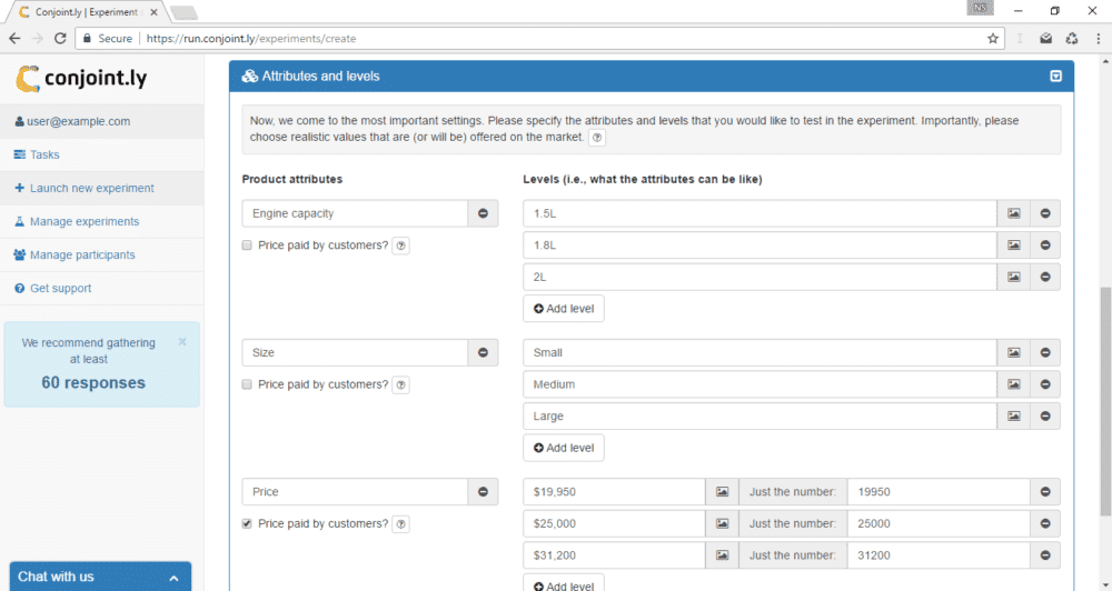 Conjoint.ly automatically recommends a minimum sample size. In most cases, it is between 50 and 300 valid responses (which means you will need to invite several hundred respondents given that probably not everyone will take part). In our calculations, we use a proprietary formula that takes into account the number of attributes, levels, and other experimental settings. Conjoint.ly estimates a hierarchical bayesian (HB) multinomial logit model of choice using responses deemed valid.