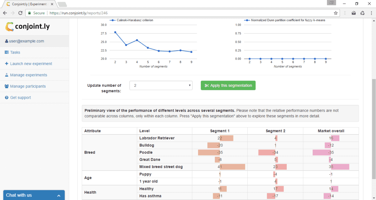 Conjoint.ly forms the complete list of product constructs using all possible combinations of levels and ranks them based on a score computed from the relative level value scores (partworths).Segmentation. Conjoint.ly segments the market based on the individual coeffients from the estimated HB multinomial logit model using k-means clustering. We provide the values of the Calinski-Harabasz criterion (to help choose the appropriate number of clusters) and the normalised (0 to 1) Dunn partition coefficient for fuzzy k-means (to help choose the appropriate number of clusters as well as to decide if segmentation at all is crisp and hence appropriate). We provide the same reporting for each segment."