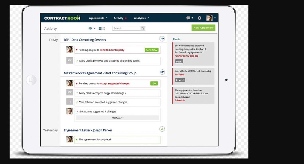 Hold vendors accountable for compliance breaches.Get more agreements completed faster. Monitor collaboration internally and externally from proposal to contract. Get automatic alerts of any legal and/or business changes affecting renewals. ContractRoom is a truly unique solution that fills this significant gap in the enterprise software landscape via its end-to-end Digital Transaction Management (DTM) platform.