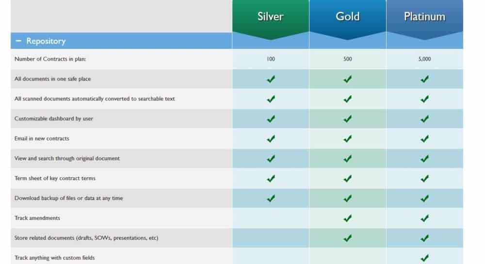 Some additional features are the possibility of customization of the dashboard, always including a term sheet of key contract terms, and the possibility of storing related documents within the same system such as drafts, SOWs, or presentations.