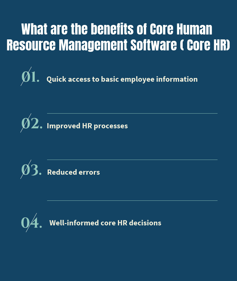 - Database: Core HR systems come with a central database that stores and manages records for every employee. The database contains data on employee personal details, job profiles, promotions, salaries, and other types of data we’ve already mentioned.