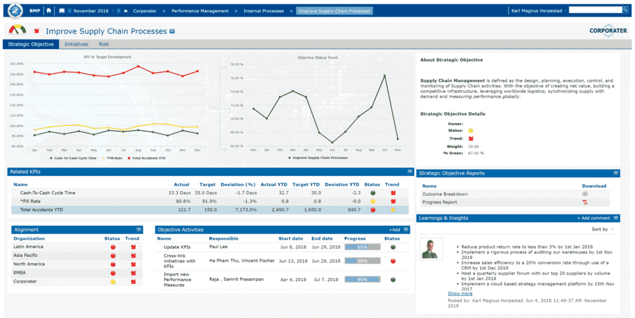 Corporater Balanced Scorecard is a software solution that supports customers in executing their strategy. It provides everything out of the box that is needed for the Balanced Scorecard (BSC) framework, including perspectives, strategic objectives, KPIs, strategic initiatives, visualization tools, data integration, and workflow.