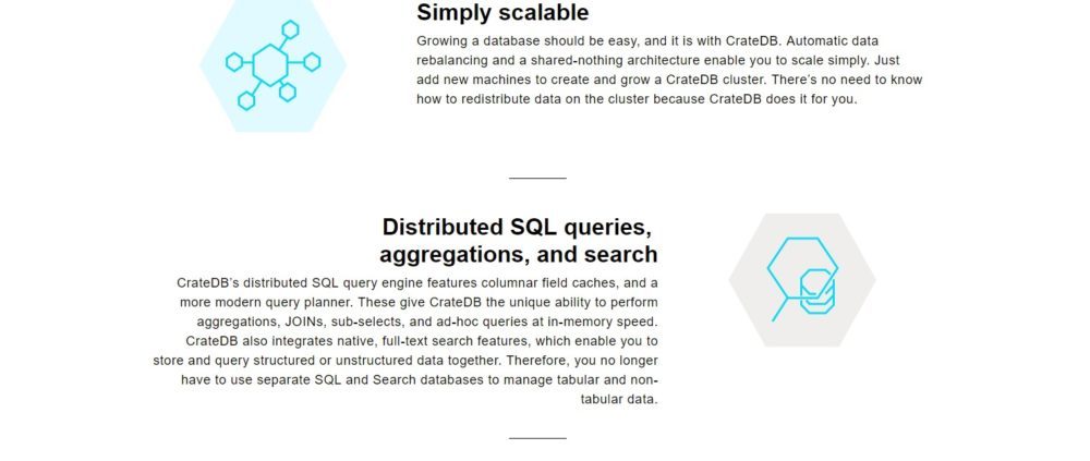 CrateDB is a distributed SQL database built on top of a NoSQL foundation. It combines the familiarity of SQL with the scalability and data flexibility of NoSQL, enabling developers to: Use SQL to process any type of data, structured or unstructured; Perform SQL queries at real time speed, even JOINs and aggregates and scale simply. CrateDB’s distributed SQL query engine features columnar field caches, and a more modern query planner. These give CrateDB the unique ability to perform aggregations, JOINs, sub-selects, and ad-hoc queries at in-memory speed. CrateDB also integrates native, full-text search features, which enable users to store and query structured or unstructured data together. Automatic replication of data across the cluster and rolling software updates help ensure hardware failures and scheduled maintenance do not interrupt access to data. In addition, CrateDB clusters are self healing, so when nodes are added to the cluster, CrateDB automatically loads them with data. Analytic data is often loaded in batches, with transactional locks and other overhead. By contrast, CrateDB eliminates locking overhead to enable massive write performance (e.g. 40.000+ inserts per second per node on commodity hardware). Furthermore, CrateDB can deliver millisecond-speed query performance, even when writes are in action. All nested JSON attributes can be included in any SQL command. CrateDB makes time series analysis fast and easy with automatic table partitions, which are like virtual tables that can be queried, moved or deleted. Partitioning data by time intervals delivers very fast time series query performance. It offers Optimistic Concurrency Control by providing an internal versioning that allows detection and resolution of write conflicts.