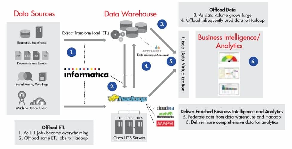 The Data Warehouse Optimization solution works with a customer’s Apache Hadoop distribution of choice, including Cloudera, Hortonworks and MapR. The solution provides a complete software, networking and computing infrastructure for utilizing big data in all its varieties, encompassing Informatica Big Data Edition, Cisco Data Virtualization Platform and Cisco Unified Computing System.